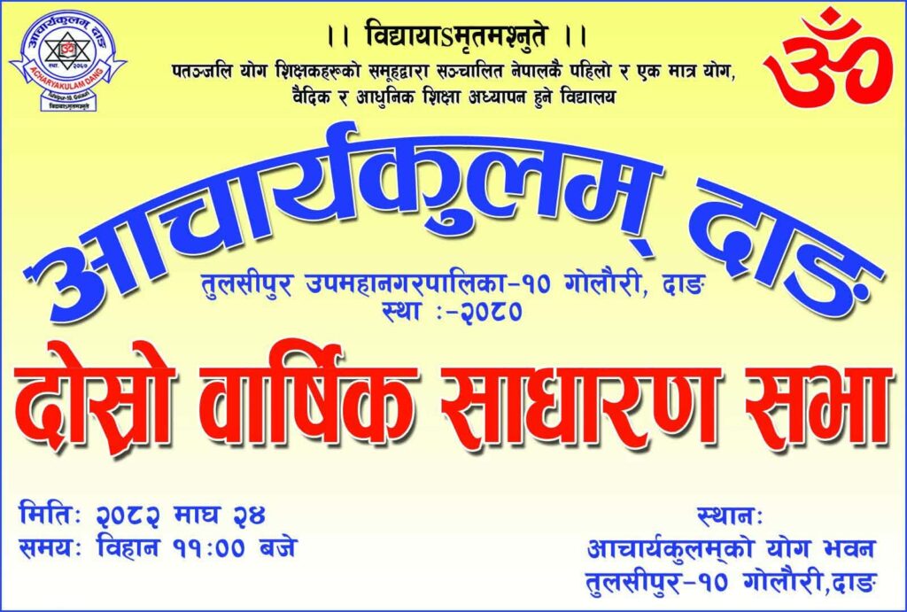 तुलसीपुर उपमहानगरपालिका १० गोलौरीमा सञ्चालित आचार्यकुलम् दाङले एक कार्यक्रम बिच आफ्नाे दोस्रो वार्षिक साधारण सभा सम्पन्न गरेकाेण छ। शिक्षा, योग, संस्कार र संस्कृत अध्ययनलाई एकैसाथ अघि बढाउँदै समाज रूपान्तरणको अभियानमा जुटेको आचार्यकुलम् दाङले साधारणसभा मार्फत आफ्नो भावी योजना र सामाजिक प्रतिबद्धता सार्वजनिक गरेको हाे। आचार्यकुलम् दाङका अध्यक्ष दीपक बस्यालकाे अध्यक्षता एंव साध्वी देव कृपा ज्यूको प्रमुख आतिथ्यतामा दोस्रो वार्षिक साधारण सभा सम्पन्न भएको हाे । कार्यक्रममा लुम्बिनी प्रदेश प्रभारी प्रेम शाह, पतञ्जलि योग समिति नेपालका आजीवन सदस्य उत्तम कुमार श्रेष्ठ लगायत विशिष्ट अतिथिहरूको उल्लेखनीय सहभागिता रहेको थियो।